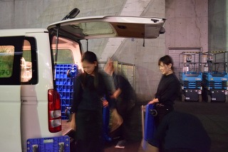 搬入の現場!台車を使って荷降ろしの真っ最中!女性スタッフもちゃきちゃき働いてくれます!