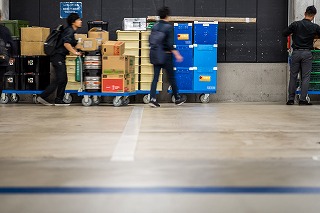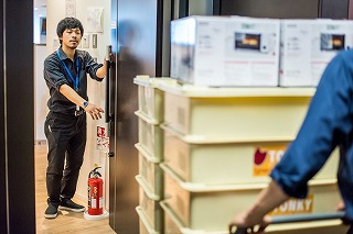 ビル専用の台車をお借りして、道具の種類ごとに荷下ろしします
