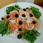 薄くスライスしたオニオンの上にスモークしたノルウェーサーモン、ブラックオリーブをあしらい、