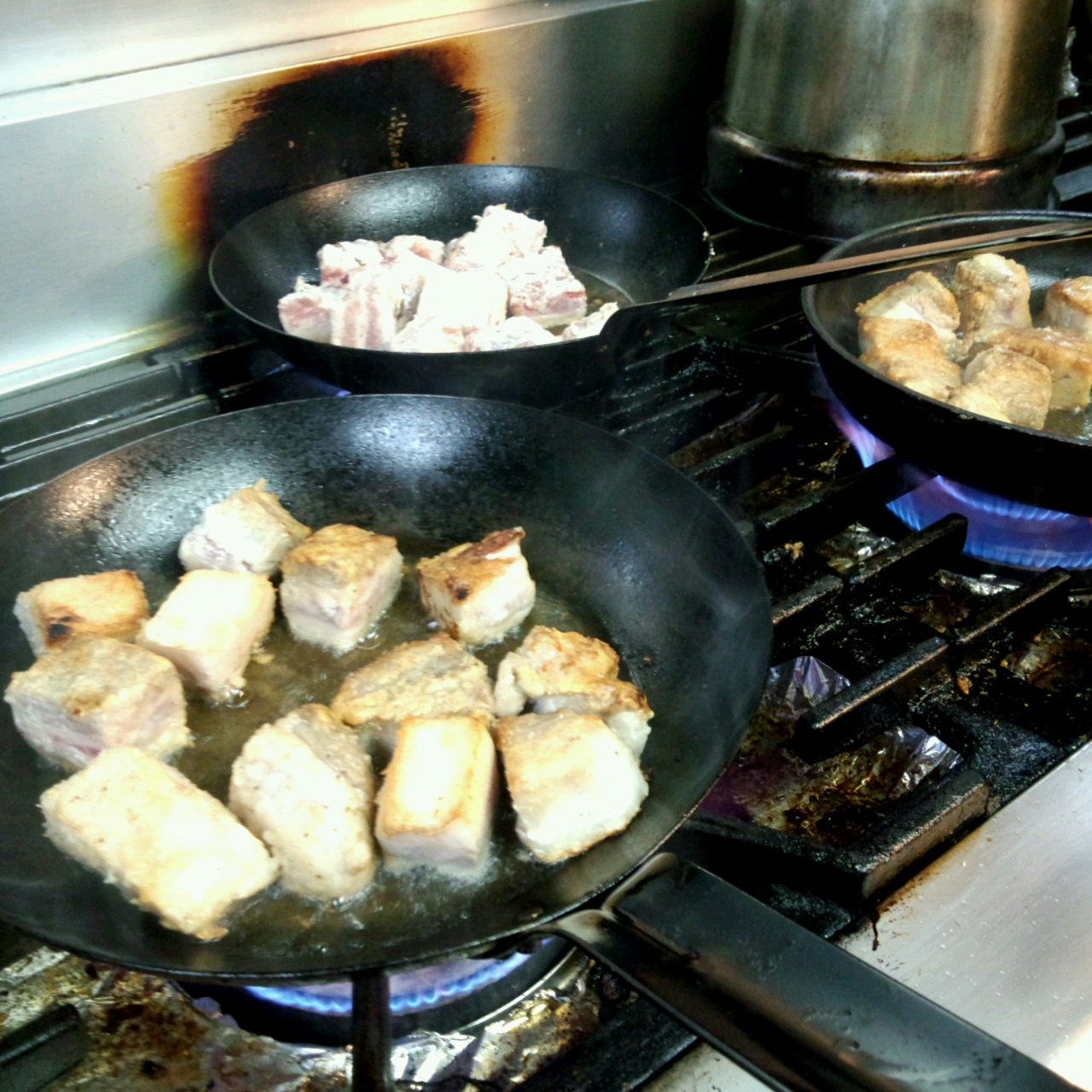 豚肉に下味をつけ、粉をさっとまぶし、フライパンで表面に焼き色を付けます。